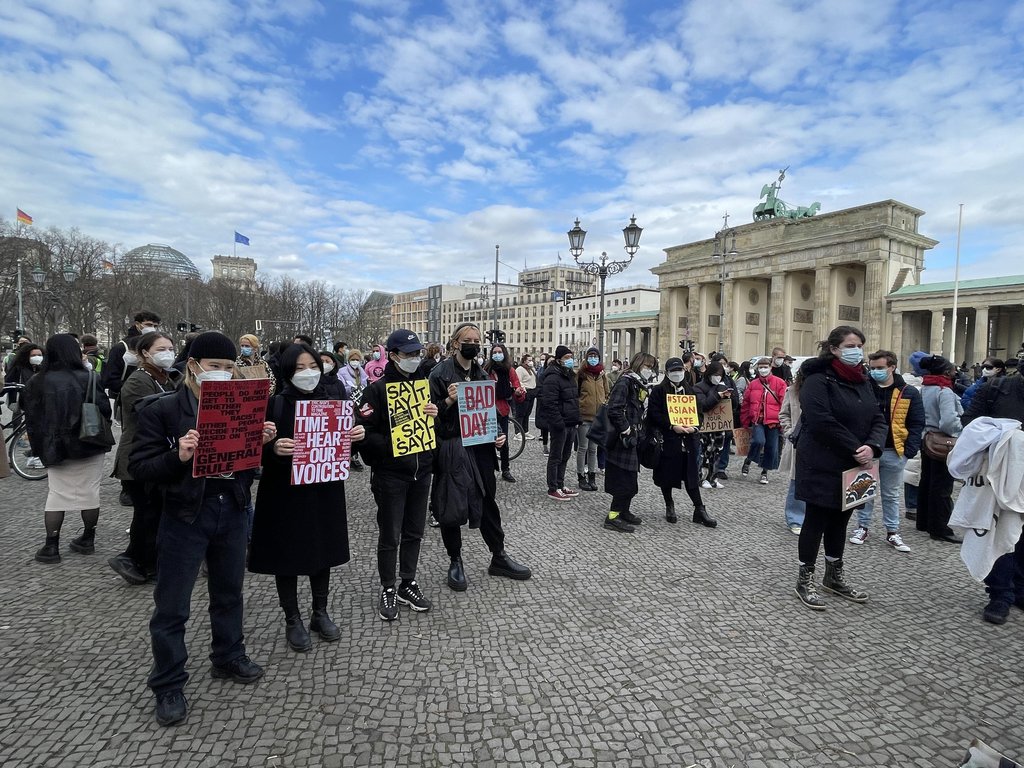 "아시아계 증오범죄 멈춰라": 아시아계 2세들이 지난 3월28일 독일 브란덴부르크문 앞에서 미국 애틀랜타 총격 사건 희생자들을 애도하고 아시아계에 대한 증오범죄를 멈추라고 촉구하는 집회를 열었다.