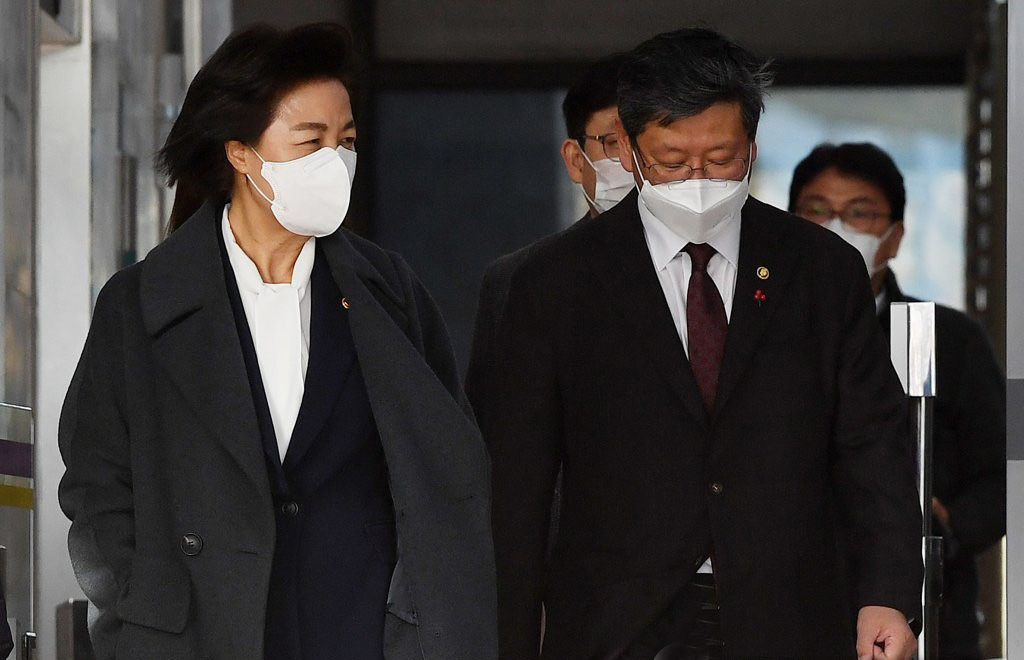 1월 25일 당시 '택시기사 폭행' 논란에 휩싸인 이용구 법무부 차관(오른쪽)이 추미애 장관과 함께 정부과천청사 법무부에서 걸어 나오던 모습
