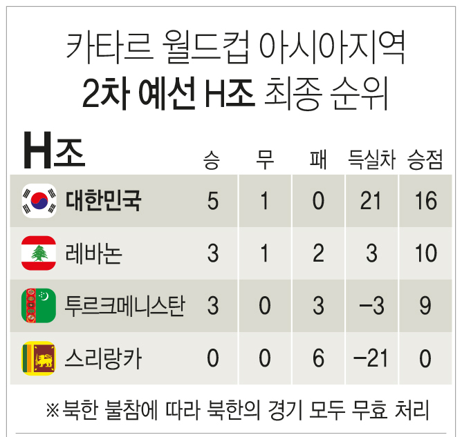 한국은 H조 2차 예선에서 6경기 연속 무패(5승 1무·승점 16)를 펼치면서 조 1위로 최종 예선 무대에 올랐다.