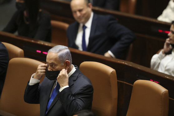 이임하는 베냐민 네타냐후 총리(앞쪽)가 13일 이스라엘 의회에서 개의를 기다리며, 후임 총리로 지명된 나프탈리 베네트(뒤쪽) 앞줄에 앉아 마스크를 고쳐 매고 있다. 예루살렘/AP 연합뉴스