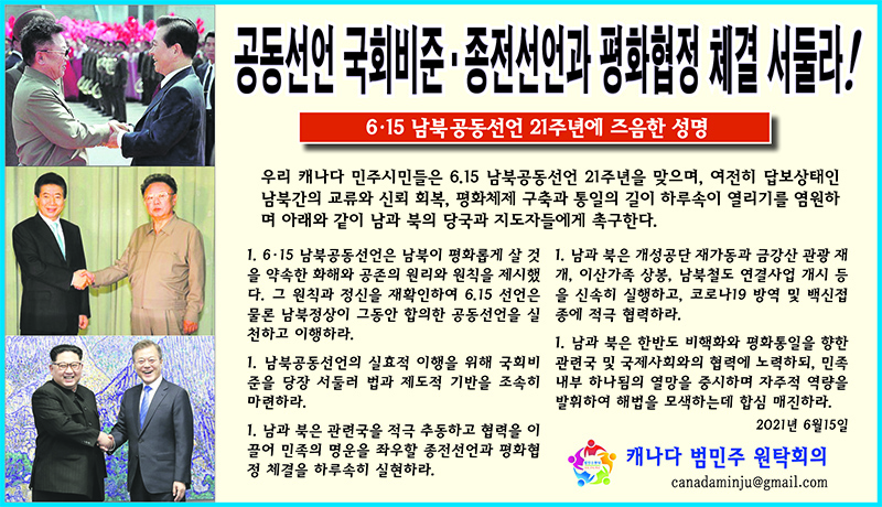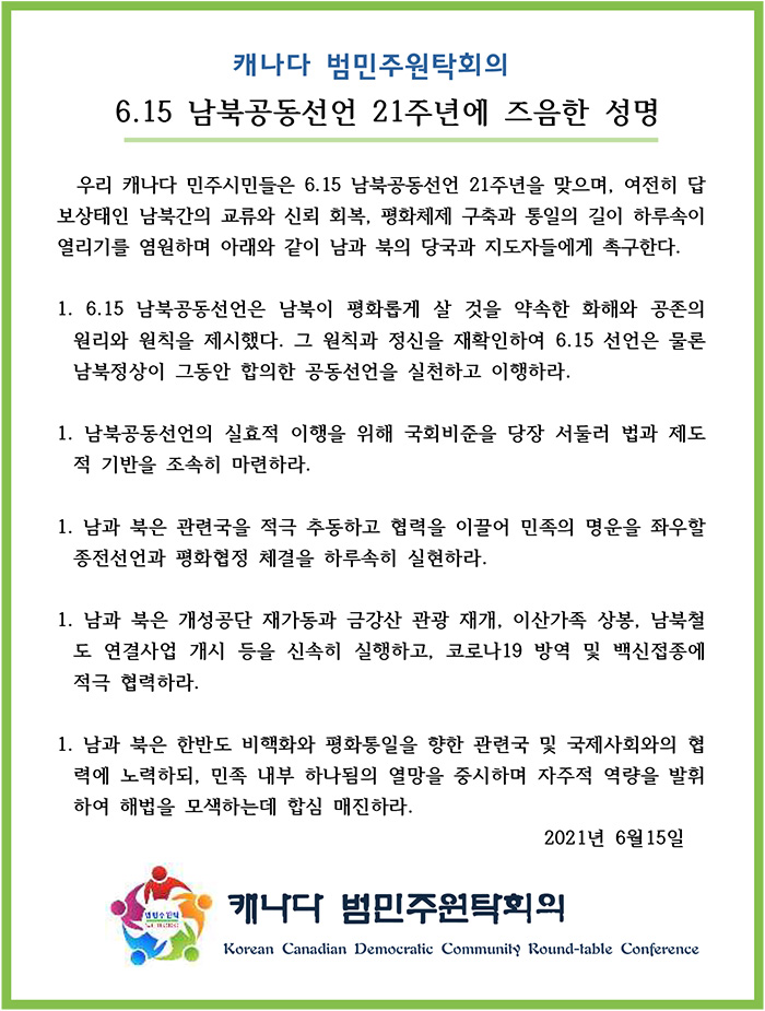 6.15 남북공동선언 21주년을 맞아 「캐나다 범민주원탁회의」가 6.15선언을 포함한 남북 간의 그간 합의했던 공동선언들의 실천과 국회비준, 종전선언 및 평화협정 체결, 그리고 개성공단 재개를 비롯한 교류협력 사업들의 조속 시행을 남과 북의 당국과 지도자들에게 촉구하는 성명을 발표했다.