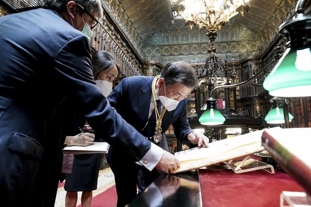 스페인을 국빈 순방 중인 문재인 대통령이 16일 마드리드에 있는 상원 도서관을 방문해 1730년대 독도를 조선 영토에 포함해 작성한 ‘조선왕국전도’를 만났다.