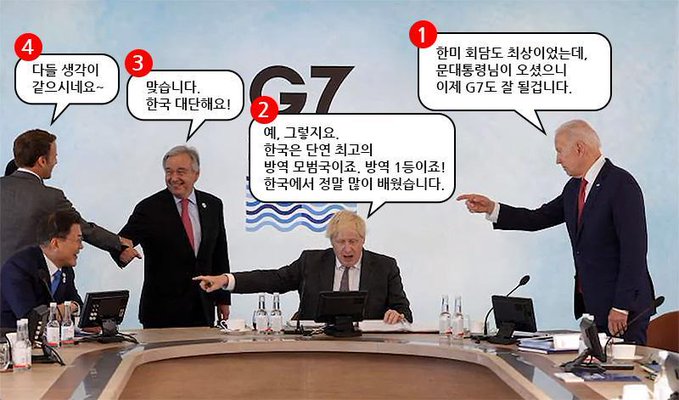 아이디가 ‘쿠마쿠마’인 누리꾼은 16일 이 사진과 함께 “이게 무슨 상황인가 했더니 보리스(존슨 영국 총리)가 의제 내용을 확인하고 ‘방역 넘버원’은 이 사람의 나라다”라고 하니까 바이든이 동시에 (문 대통령을) 가리키는 장면이었다”는 글을 올렸다. 그는 이어 “뭔가 고등학생이 ‘이 사람입니다’ 하는 것 같은 분위기로 보여 재밌다”는 소감을 덧붙였다.