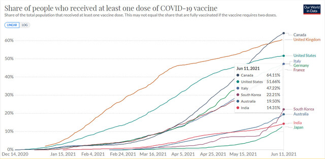 * 코로나19 백신 접종률 추이(지난 11일 기준). 일본이 다른 주요7개국 회원국에 견줘 백신 접종률이 낮은 것을 확인할 수 있다.