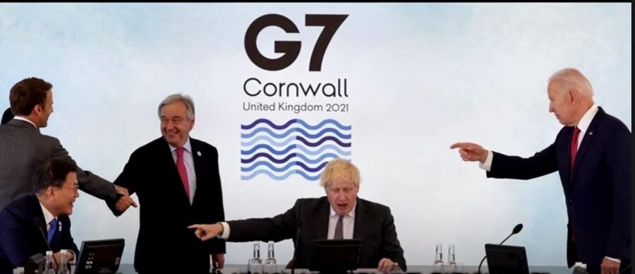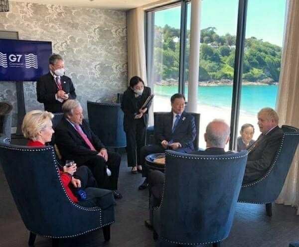 박 수석이 공개한 대화 내용을 보면, 먼저 바이든 대통령이 “한미 회담도 최상이었는데 문 대통령님이 오셨으니 이제 G7도 잘될 것이다”라고 말했다고 한다. 그러자 존슨 총리가 “네, 그렇죠, 한국은 단연 세계 최고의 방역 모범국이죠. 방역 1등이죠”라고 맞장구를 쳤다. 박 수석은 이런 대화 중에 존슨 총리가 문 대통령을 지목하는 장면이 연출됐다고 설명했다. 이때 옆에 서있던 구테헤스 유엔(UN) 사무총장은 역시 “한국 대단해요”라고 이야기했고, 마크롱 프랑스 대통령도 “다들 생각이 같으시네요”라고 동의했다는 것이다.