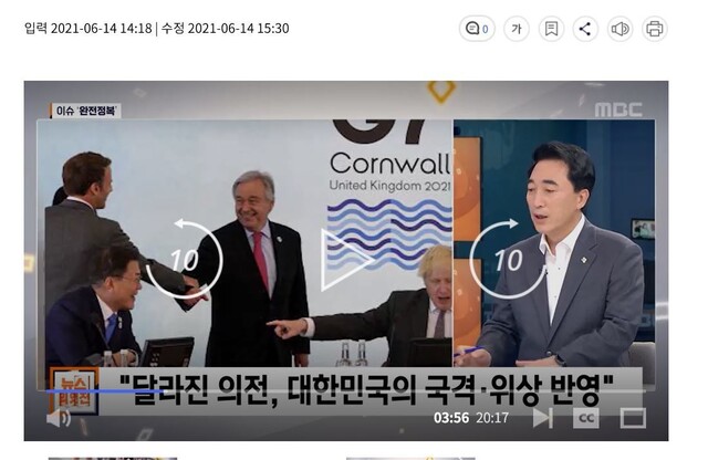 이 글에는 “스가 총리는 어디 있나”, “한국이라는 나라 자체의 신뢰도가 보이는 장면” 등의 댓글이 달렸다. 이 장면이 찍힌 확대회의는 코로나19 대응을 다루는 ‘보건’ 세션이었다. 7월 도쿄올림픽 개막을 앞두고 스가 총리는 코로나19 방역에 총력을 기울였지만, 주요 7개국 회원국에 견줘 백신 접종률은 뒤처진 상태였다.