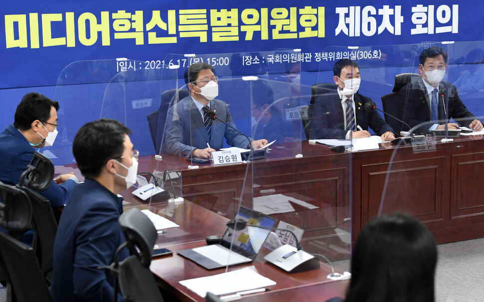*17일 국회 의원회관에서 열린 더불어민주당 미디어혁신특별위원회 제6차 회의에서 김용민 위원장이 발언하고 있다. 연합뉴스