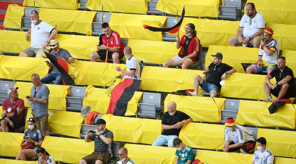 *19일(현지시간) 2020 유럽축구선수권대회(유로 2020) 독일과 포르두갈 경기를 보러 뮌헨의 알리안츠 아레나에 온 응원단이 사회적 거리두기를 지키고 관중석에 앉아 있다. [AFP=연합뉴스]