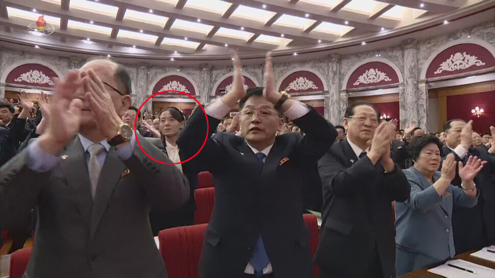 조선노동당 중앙위 8기3차 전원회의 당시의 김여정 당 중앙위 부부장 모습(붉은 원 안). 회의 사흘째인 17일 김여정 부부장을 포함한 참석자들이 모두 일어서 박수를 치고 있는 모습을 18일 <조선중앙텔레비전>이 보도했다. <조선중앙텔레비전> 화면 갈무리, 연합뉴스