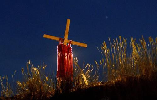 캠루프스 기숙학교 인근 고속도로 인근에 세워진 십자가와 어린이 드레스 [AFP=연합뉴스]