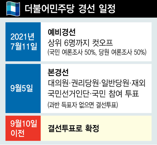일반국민(50%), 당원(50%) 여론조사 결과를 합산하는 방식으로 ‘컷오프’가 시행된다. 6명 후보들이 벌이는 본경선일은 9월5일이며 과반득표자가 없으면 결선투표로 이어진다. ‘180일 규정’에 따라 민주당이 대선후보를 확정해야 하는 시한은 올해 9월10일이다. 서영지 노지원 기자