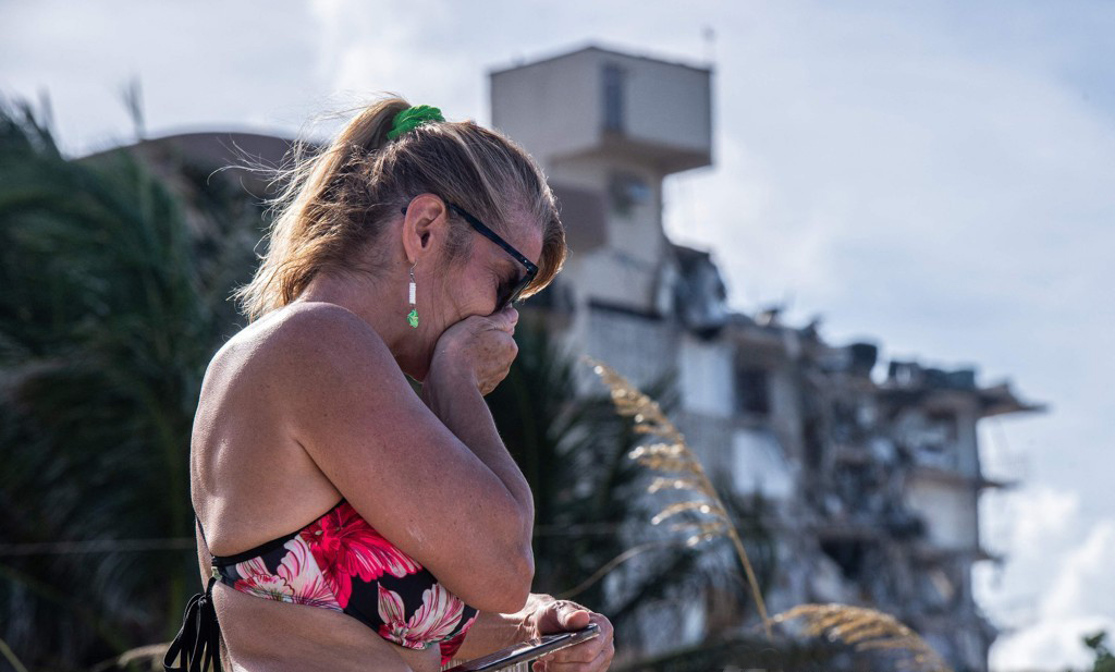*참사 현장에서 슬퍼하는 시민: 미국 플로리다주 12층 아파트 붕괴 참사 나흘째인 27일 수색 작업이 이어지고 있으나 시간이 흐르면서 인명 구조에 대한 기대감이 점점 옅어지고 있다. 참사 현장에서 슬퍼하는 시민[AFP=연합뉴스]