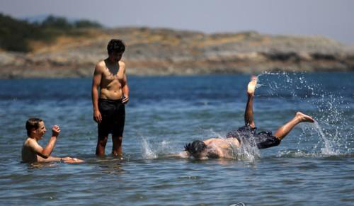 28일 캐나다 브리티시콜럼비아주 빅토리아의 윌로비치에서 사람들이 물놀이를 하며 열을 식히고 있다. [로이터=연합뉴스]