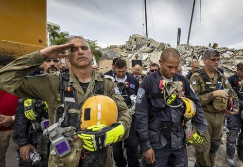 미국 플로리다주 아파트 붕괴 수색현장에서 잠시 일손을 멈추고 묵념을 하는 구조대원들 [마이애미헤럴드/AP=연합뉴스]