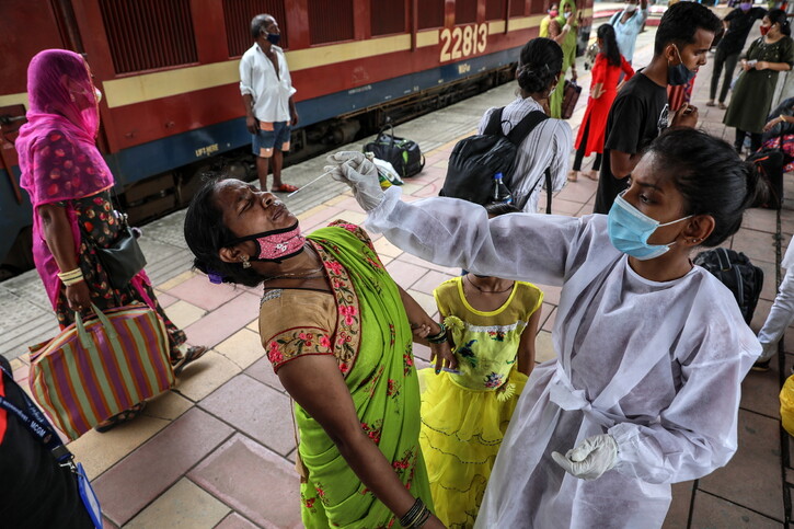 29일 인도 뭄바이의 기차역에서 의료진이 시민을 대상으로 코로나19 검사를 하고 있다. 뭄바이/EPA 연합뉴스
