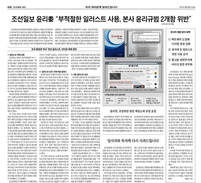 조선일보는 30일치 A28면에 ‘독자 여러분께 알려드립니다’라는 면제목을 붙였다. 해당 면에는 △일러스트 인터넷 게재 경위 △본사의 재발 방지 대책 △당사자와 독자께 사과 △조선일보 윤리위원회(윤리위)의 규정 위반 관련 책임소재 규명 요청 등이 실렸다.