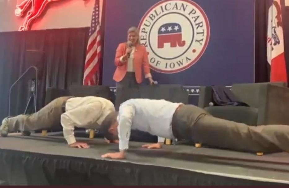 둘은 곧 얼굴을 마주 보며 엎드린 채 팔굽혀펴기를 시작했고 조니 언스트(50·아이오와주) 상원의원이 곁에서 숫자를 셌다.