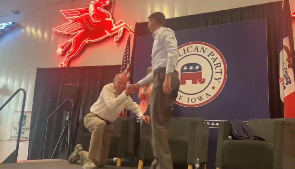 그래슬리 의원은 이날 무대에 먼저 올라 육군 대위로 전역한 40대 코튼 의원을 가리키며 "그와 나는 팔굽혀 펴기 22개를 할 것입니다"라고 말했다.