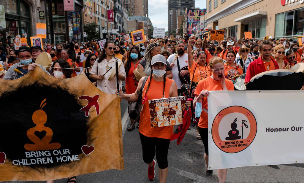 건국기념일인 전날 캐나다 곳곳에선 기념행사 대신 인종청소 피해 원주민 어린이들을 애도하는 시위가 벌어졌다.
