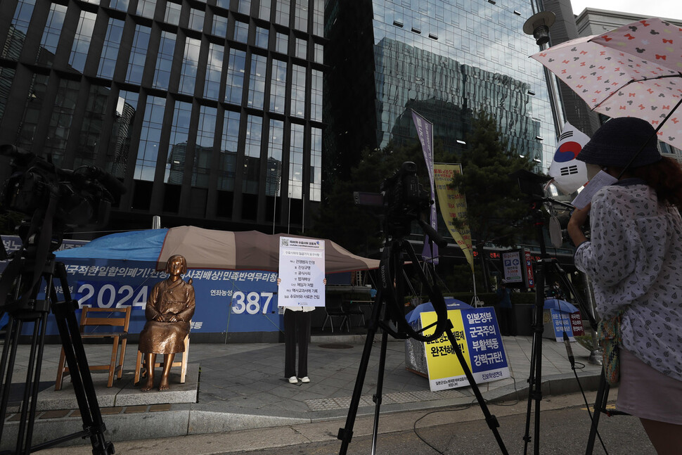 제1500차 일본군 성노예제 문제해결을 위한 정기 수요시위가 14일 낮 서울 종로구 중학동 옛 주한일본대사관 앞에서 열리고 있다. 이날 시위는 코로나19 사회적 거리두기 4단계 격상으로 인해 1인 시위로 진행됐다.