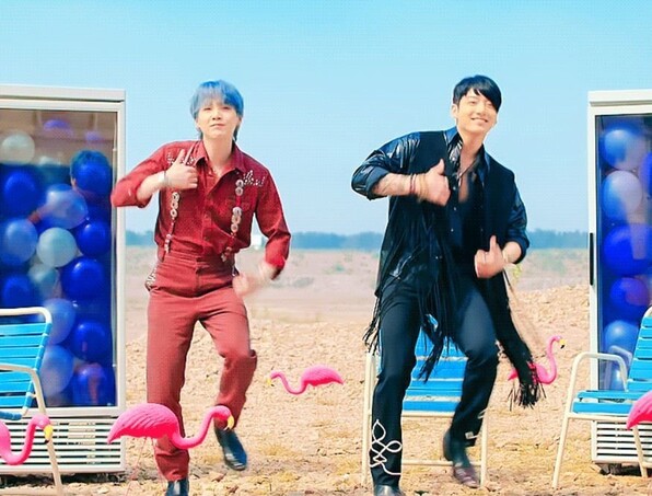 * ‘즐겁다’를 표현하는 슈가와 정국. 뮤직비디오 갈무리