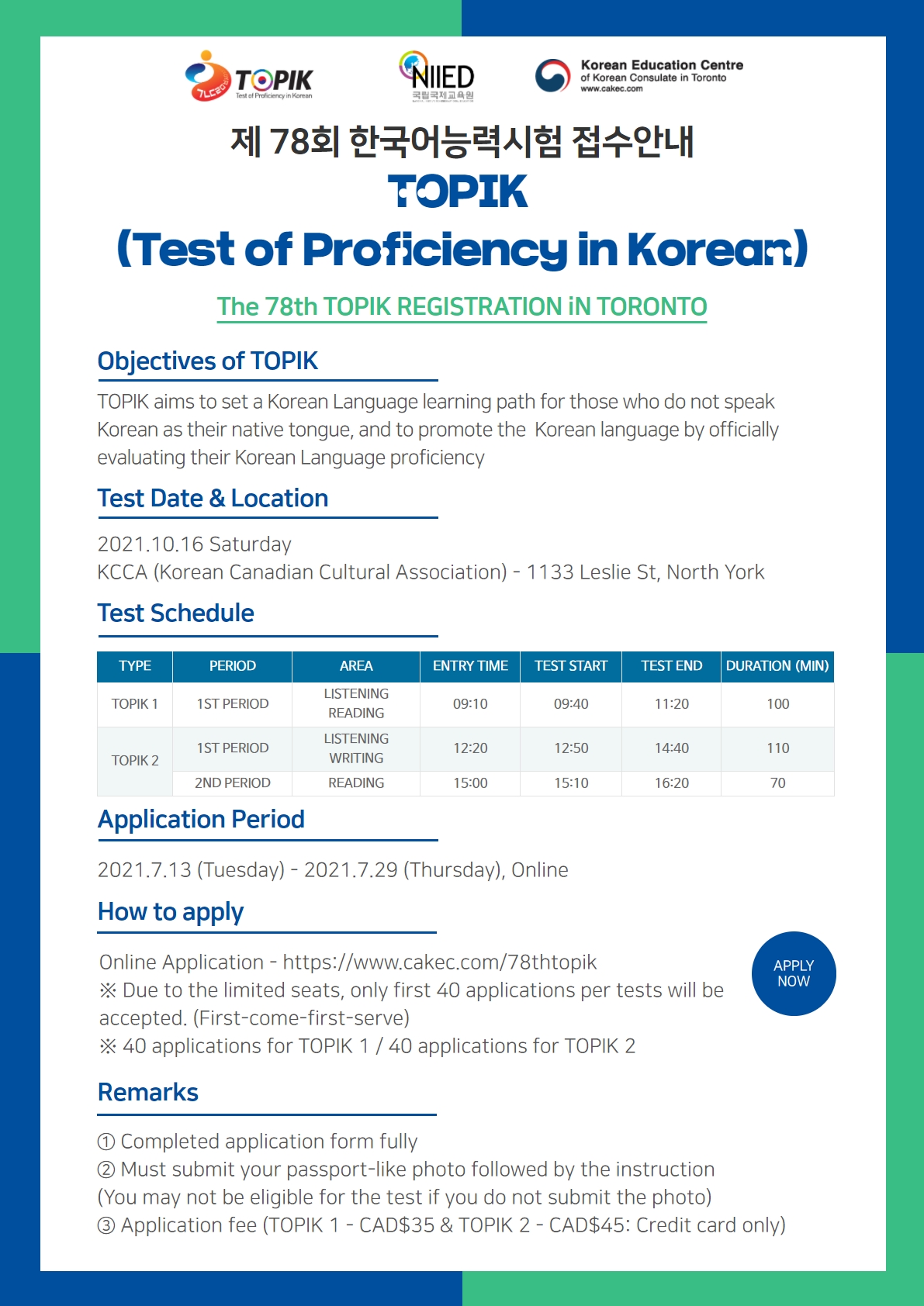 10월 한국어 능력시험 응시원서는 7월29일까지 총영사관 교육원 홈페이지(https://www.cakec.com/78thtopik)를 통해 온라인으로 접수할 수 있다. 올해는 COVID-19 사회적 거리두기 지침에 따라 수준별 TOPIK-1과 TOPIK-2의 시험장 수용 인원을 각각 최대 40명으로 제한해 선착순으로 신청을 받는다.