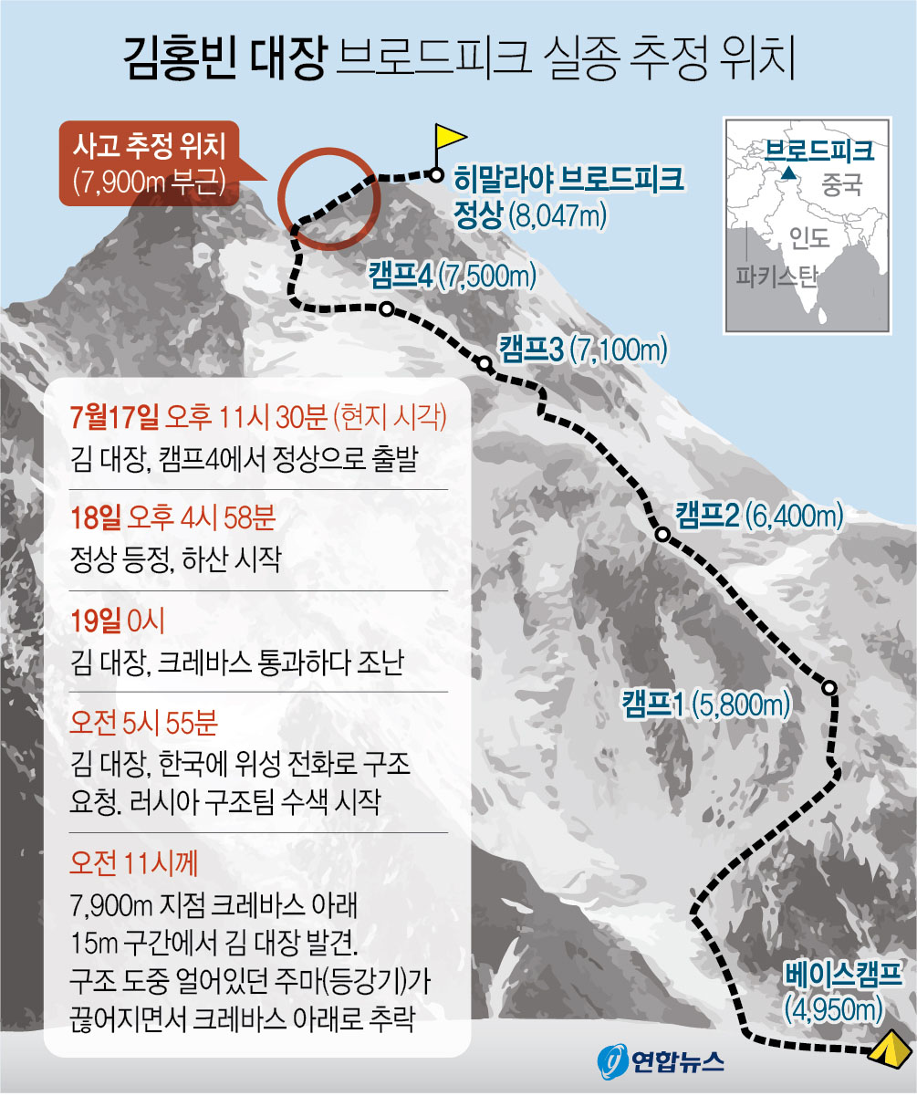 김 대장은 앞서 현지시간 18일 오후 4시 58분 파키스탄령 카슈미르 북동부 브로드피크 정상 등정을 마치고 하산하던 도중 해발 7천900m 부근에서 조난 사고를 당했다.
