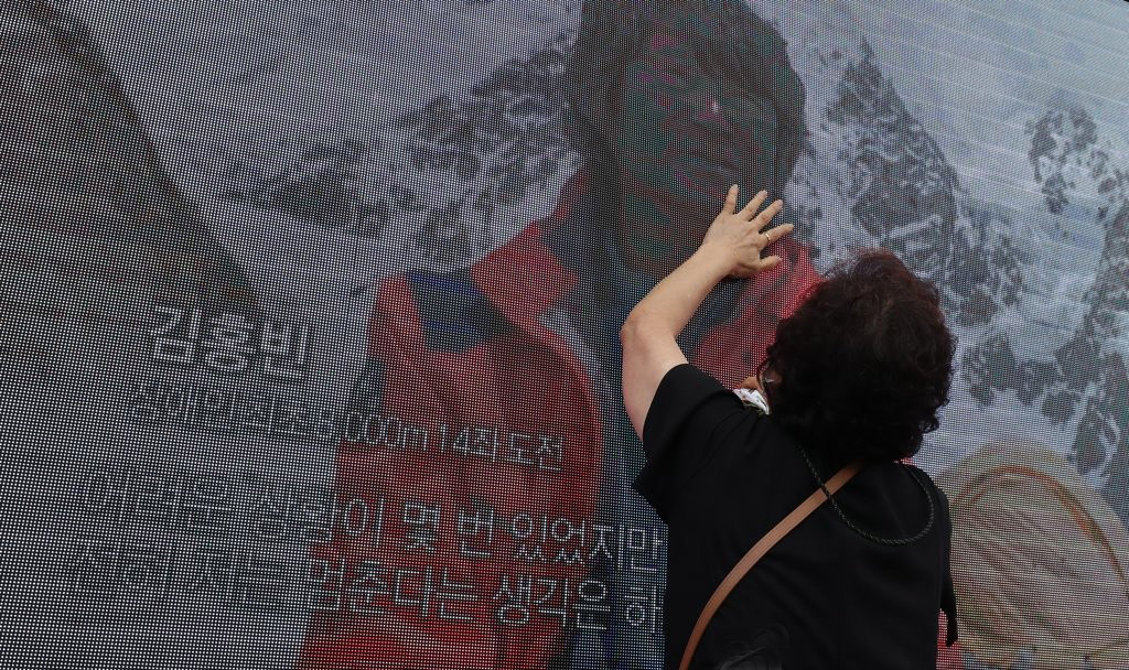 돌아오지 못한 김홍빈 대장, 오열하는 가족= 4일 오전 광주 서구 염주체육관에 마련된 김홍빈 대장 분향소 앞에서 유가족이 고인의 생전 모습이 상영된 전광판을 어루만지며 오열하고 있다.
