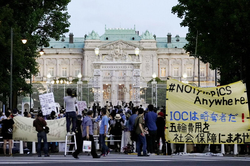 *올림픽 반대 시위대가 18일 토마스 바흐 국제올림픽위원회(IOC) 위원장 환영행사가 열리고 있는 일본 도쿄 아카사카 영빈관(아카사카 별궁) 앞에서 시위를 벌이고 있다. 교도통신 AP 연합뉴스