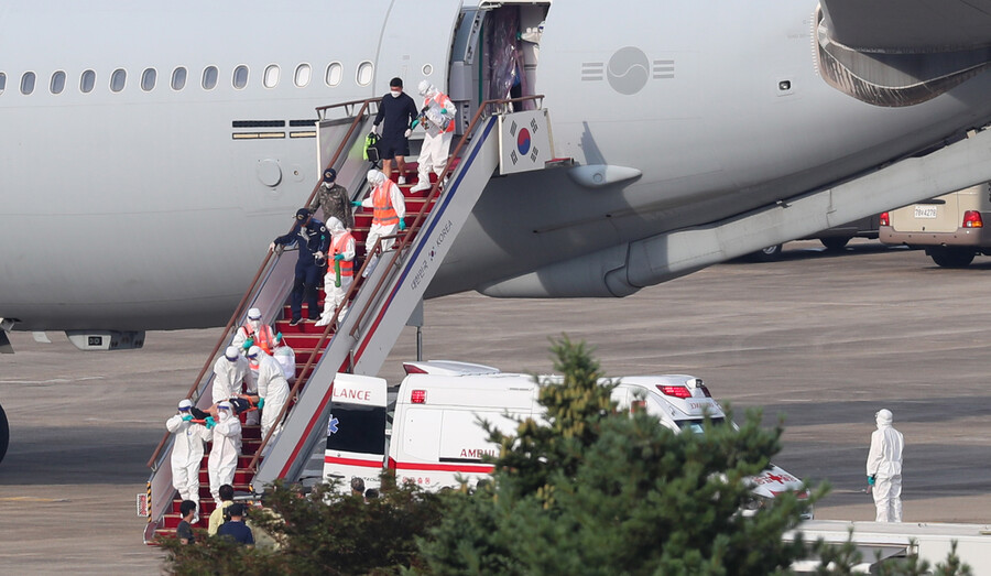 코로나19 집단감염으로 귀국한 청해부대 34진 문무대왕함의 장병들이 20일 오후 경기도 성남 서울공항에서 공군 다목적 공중급유수송기(KC-330)에서 의료진의 도움을 받으며 내리고 있다.