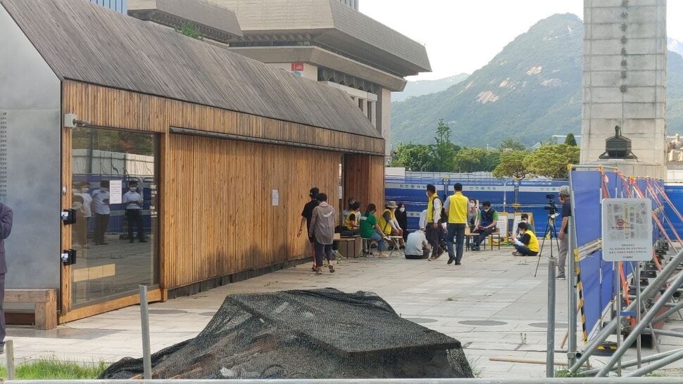 23일 오후 서울시가 물품정리를 시도하는 광화문광장 세월호 기억공간 앞에서 4·16연대 회원들과 유가족들이 대기하고 있다.