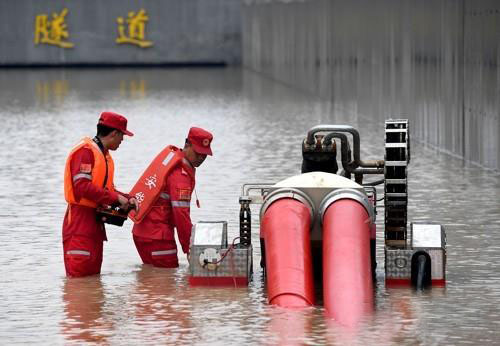 22일 배수작업 진행중인 중국 정저우 터널 (신화=연합뉴스)
