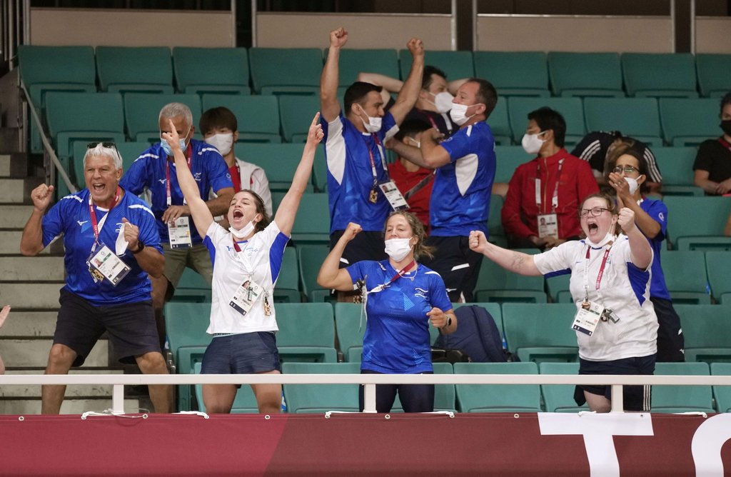 마스크 내리고 '화끈하게' 응원: 도쿄올림픽 유도 경기가 진행 중인 일본 부도칸(武道館)에서 24일 외국 선수단 관계자들이 자국 선수를 응원하고 있다. 마스크를 내리고 입을 크게 벌린 사람들도 보인다.