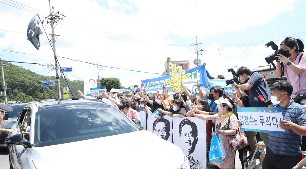 김 전 지사 지지자들은 '김경수는 무죄다' '기다리겠다'는 플래카드를 들고 김 전 지사를 응원했다.