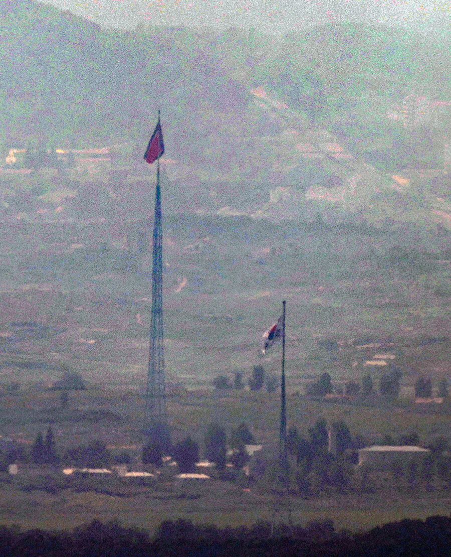27일 경기도 파주시 접경지역에서 바라본 서부전선 비무장지대(DMZ)에 남한 대성동 마을의 태극기와 북한 기정동 마을의 인공기가 펄럭이고 있다. 이날 박수현 청와대 국민소통수석은 남북이 오전 10시부터 그동안 단절됐던 남북 간 통신 연락선을 전격 복원하기로 했다고 긴급 브리핑을 통해 발표했다. 연합뉴스