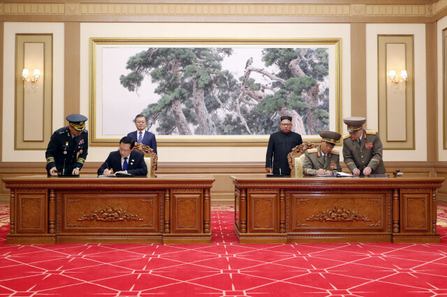 송영무 국방장관과 노광철 인민무력상이 2018년 9월19일 판문점 선언 이행을 위한 남북 군사분야 합의서에 서명하고 있다.