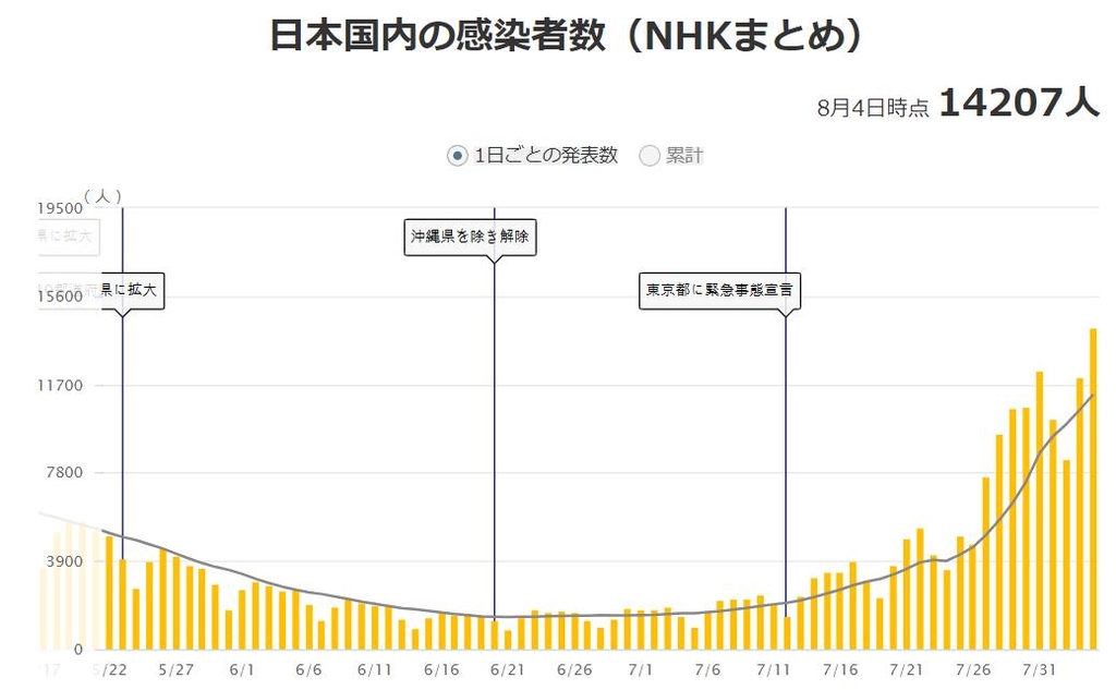 일본 코로나19 하루 확진자 추이 [NHK 홈페이지 캡처]