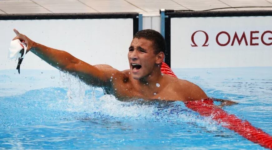 튀니지 수영선수 아흐마드 하프나위가 자유형 400m 결승에서 기록을 확인한 뒤 포효하고 있다. 도쿄올림픽 공식 누리집 갈무리.