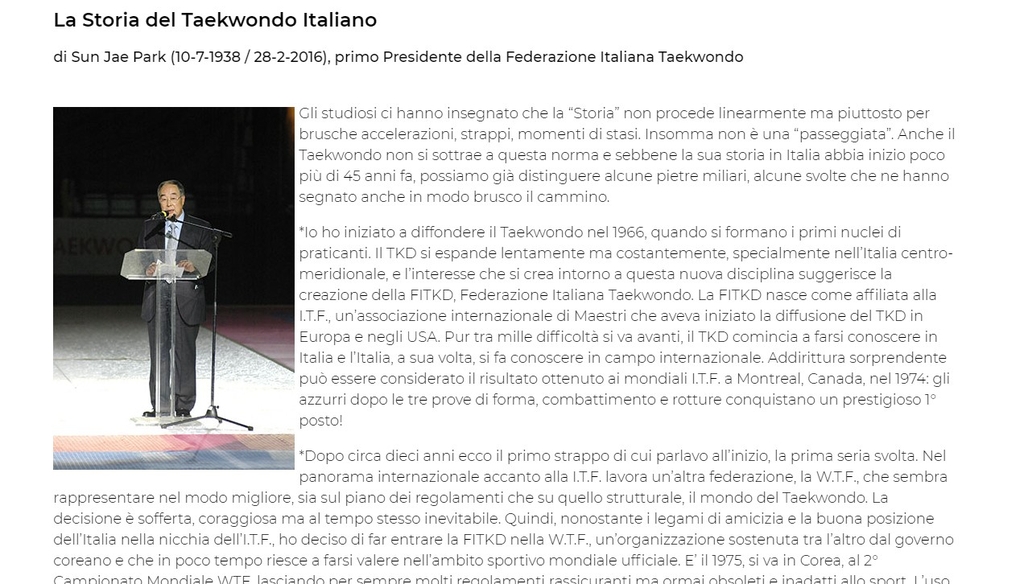 이탈리아태권도협회(FITA) 웹사이트에 소개된 협회 창설자 고 박재선씨. [FITA 웹사이트 갈무리. 재판매 및 DB 금지]