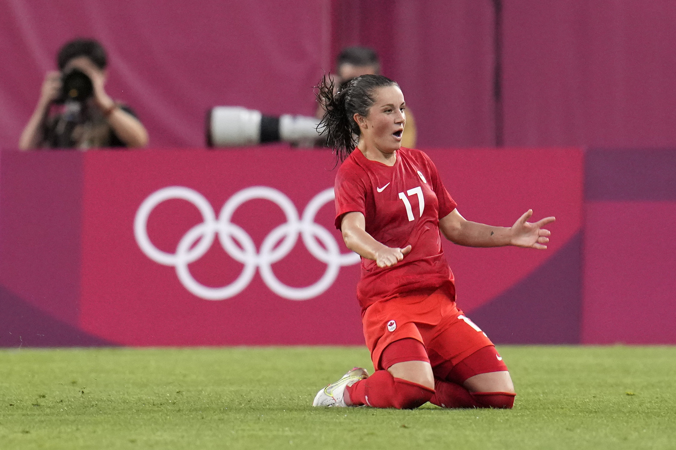 캐나다의 제시 플레밍이 2일 일본 가시마에서 열린 2020년 하계 올림픽 미국과의 여자 준결승 축구 경기에서 페널티킥으로 선제골을 넣은 뒤 기뻐하고 있다. [AP=City News]