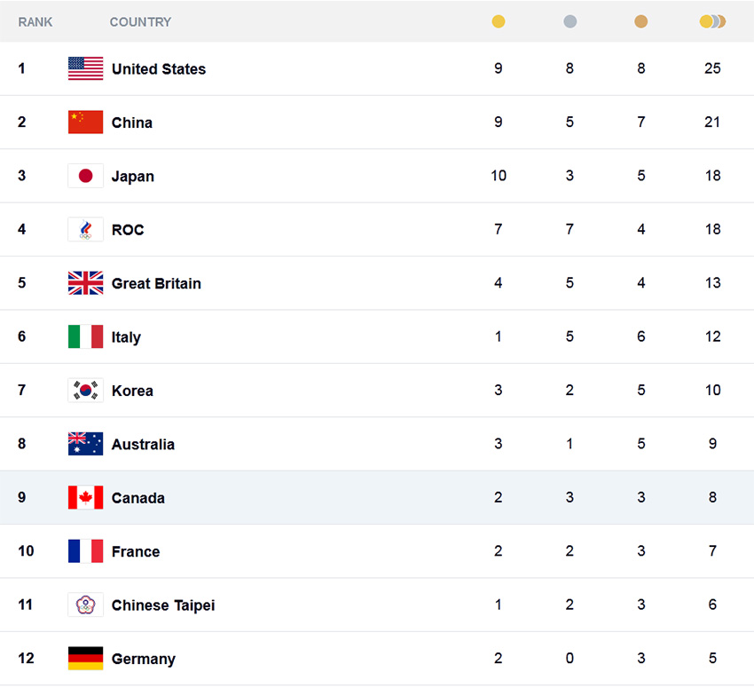 2020 도쿄 올림픽에 371명의 선수들을 파견한 캐나다는 29일 여자 페어 조정에서 동메달을 따 10번째 메달을 추가했다. 이로써 캐나다는 이날 현재 금메달 2개, 은메달 3개, 동메달 5개를 획득해 메달 합계 순위로 12위, 금메달 순위로는 공동 10위에 올라있다.