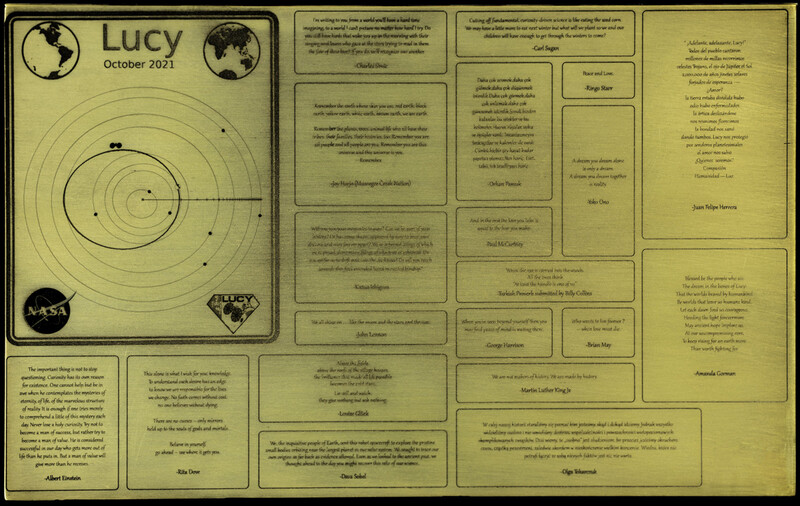 루시의 탐사 임무는 2033년에 끝날 예정이다. 하지만 그 이후에도 트로이 소행성과 지구의 궤도 사이를 적어도 수십만년 동안 계속 여행할 것이라고 나사는 설명한다. 그 경우 미래의 인류가 태양계 천체 사이를 떠도는 루시를 발견할 가능성이 있다. 나사가 루시에 네모판 형태의 타임캡슐을 실어 보내는 이유가 여기에 있다. 나사는 지난 9일 루시 탐사선 제작업체인 콜로라도 리틀턴의 록히드마틴 스페이스에서 이 금속판을 우주선에 설치하는 작업을 마쳤다.