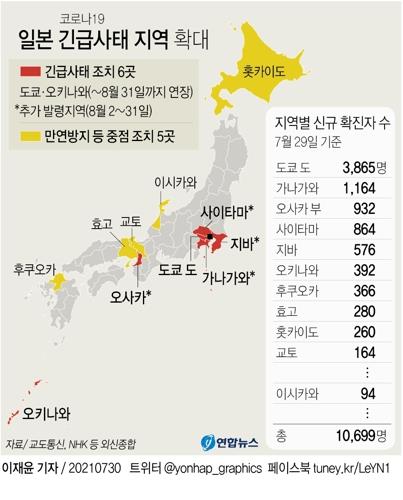 도쿄올림픽 개막 7일째인 전날(29) 일본의 전체 신규 확진자는 도쿄 3천865명을 포함해 1만699명으로, 하루 1만 명을 처음 넘어섰다.