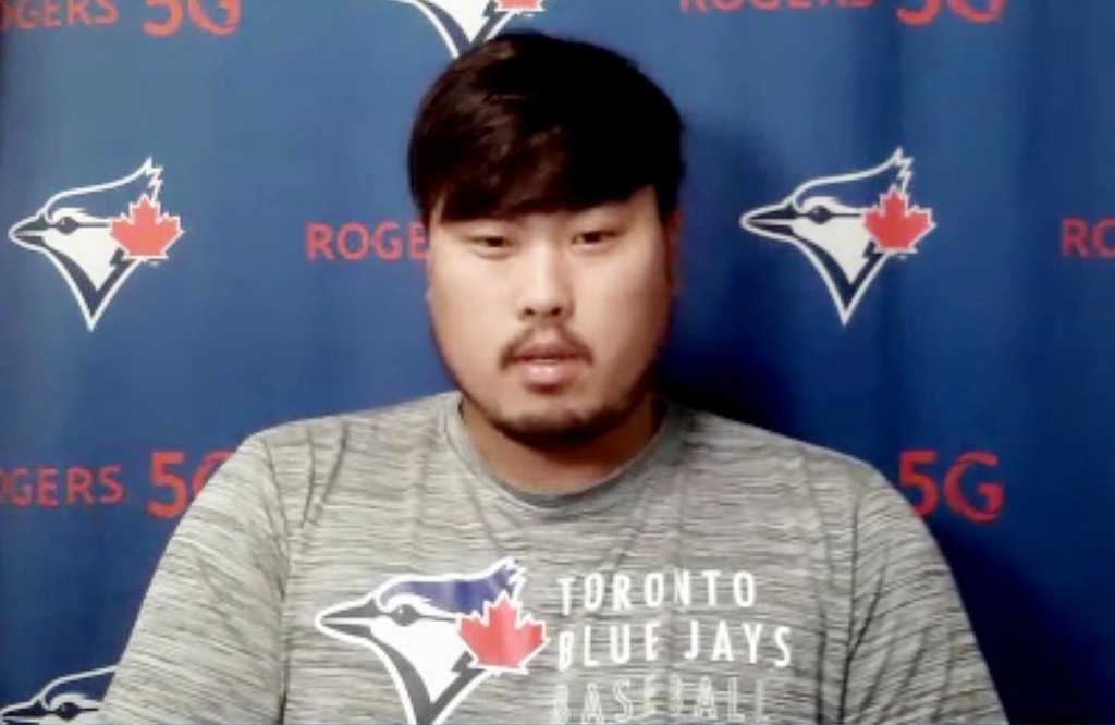 화상 인터뷰하는 류현진: 토론토 블루제이스의 류현진이 30일 메이저리그 보스턴 레드삭스와의 방문경기에 선발 등판한 뒤 취재진과 화상 인터뷰를 하고 있다. 2021.7.30 [토론토 블루제이스 화상 인터뷰 캡처]