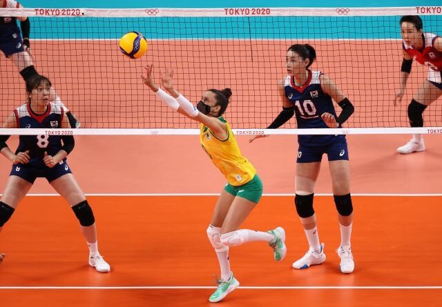 마크리스 카네이로가 25일 일본 도쿄 아리아케 아레나에서 열린 도쿄올림픽 여자배구 한국과 브라질의 경기에서 마스크를 쓴 채 뛰고 있다. 도쿄/연합뉴스