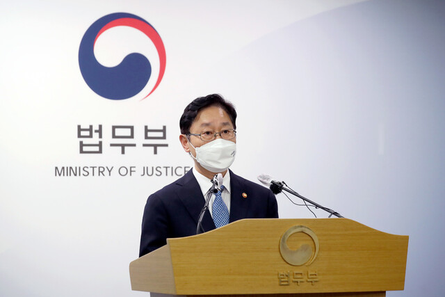 박범계 법무부 장관이 9일 오후 경기 과천시 정부과천청사 법무부 브리핑룸에서 이재용 삼성전자 부회장의 가석방 여부가 결정된 법무부 가석방심사위원회(심사위) 결과를 발표하고 있다. 연합뉴스