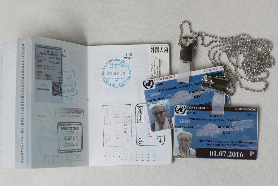 서울 종로구 중학동 옛 주한일본대사관 앞 평화로에 내리쬐는 햇볕을 막아주던 모자와 선글라스도 수요시위의 필수품이었다. 수요시위 현장에서 ‘할머니에게 명예와 인권을’이라 쓴 노란 조끼를 입고 찍은 사진과 함께 ‘여성인권운동가 김복동’이라 스스로를 소개한 명함은 그의 온 삶을 통한 발걸음이 어디로 향했는지 보여주는 상징이다. 스위스 제네바에서 열린 유엔 인권이사회 참석을 위해 사용했던 유엔 출입증과 각국의 출입국 도장이 찍혀 있는 여권은 세계 곳곳을 누비며 피해 사실을 용기 있게 증언함으로 ‘위안부’ 문제에 대한 국제사회의 관심을 높이고, 국가를 초월한 전시 성폭력 피해자들의 연대를 이끌어낸 그의 발자취를 담고 있다.