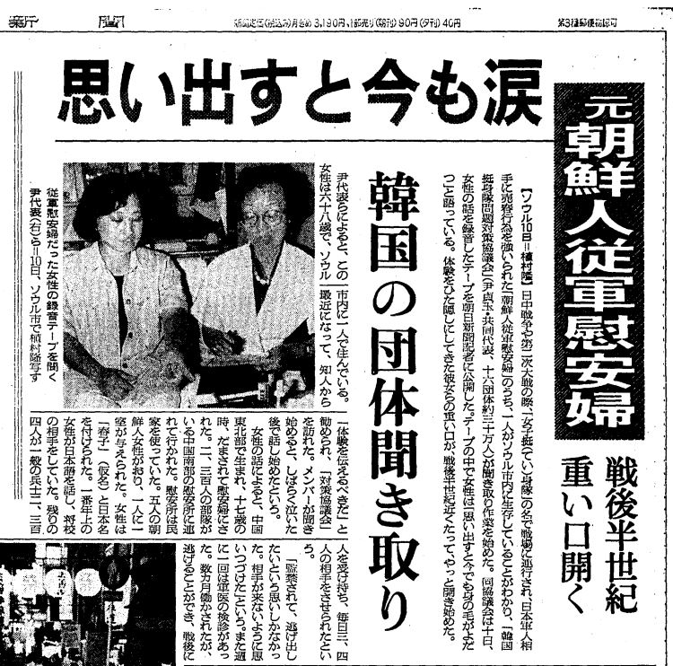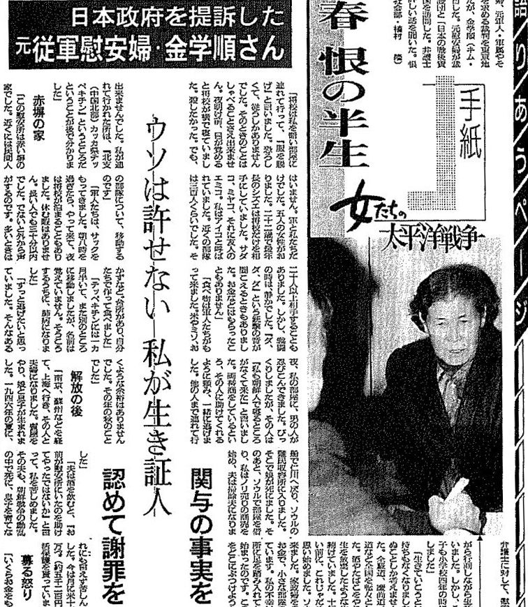 전쟁 중 동원됐던 '조선인 종군 위안부' 중 한 명이 서울에 생존해 있으며 "체험을 그저 숨겨오기만 했던 그녀들의 무거운 입이 전후 반세기 가까이 지나서 어렵게 열리기 시작했다"라고 의미를 부여하며 피해자 목소리에 귀를 기울인 보도였다.