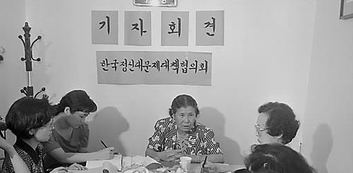 기자회견하는 김학순=일본군 위안부 피해자인 김학순 씨가 1991년 8월 14일 서울에서 열린 기자회견에서 자신이 일제 강점기에 일본군을 성적으로 상대하는 일을 강요당했다고 피해 사실을 증언하고 있다.