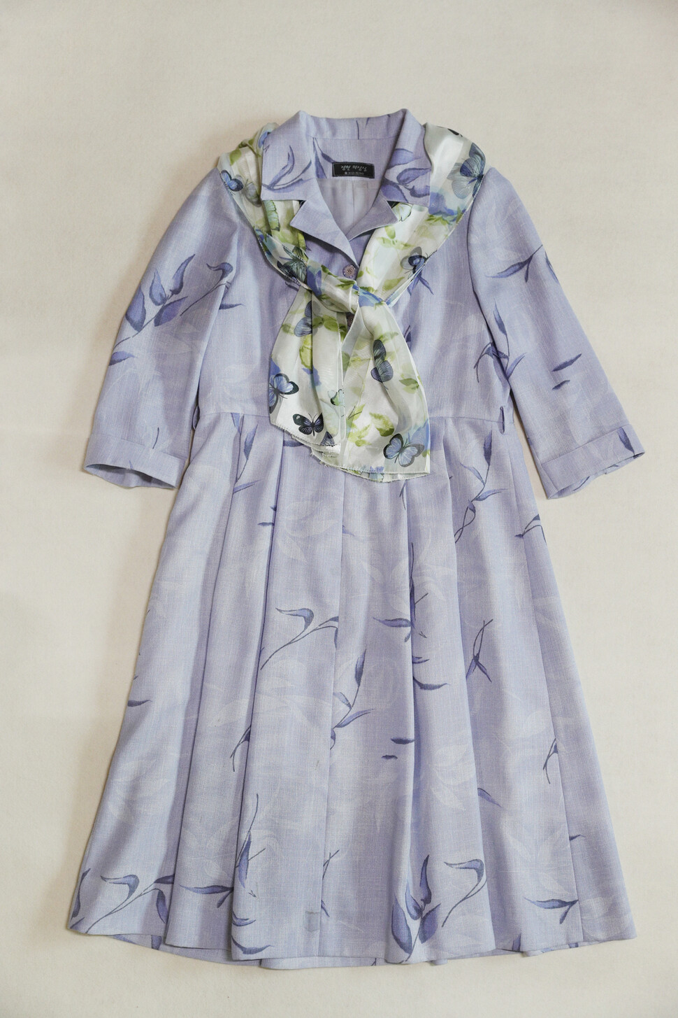 김복동 할머니가 생전에 즐겨 착용한 연보라빛 원피스와 나비 스카프